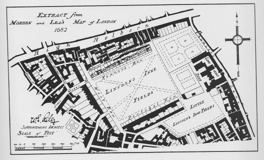 When you look at maps of London over time Lincoln’s Inn Fields is one of the few constant green spots. Here’s a map from 1682 I stumbled across in the 1911 Survey of London.