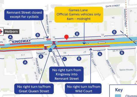 Some enquiries of Camden have unearthed the latest Olympic Route Network changes to Kingsway. It’s much more radical than earlier proposals we posted on this site – Remnant Street at the NW corner of the Fields will be blockaded to all but cycles. There will also be a barrier in the middle of Kingsway to stop people trying to turn into Great Queen Street or I suppose U-turn. I am not sure where this came from, nor what local consultations with amenity and community groups took place. Will try to find out.