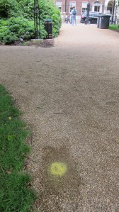 I chatted to workmen spraying green and yellow blobs at strategic points around the fields. They are preparing to put in new bins both to meet the long term need for more refuse disposal and some temporary ones for the Olympics period. The permanent bins will be of cast iron. The temporary bins will be black plastic Topsys ‘Topsy Jubilee is a Victoriana-style litter bin, manufactured in Durapol® material with a stylish textured finish.‘ Locations will be weighted to the sunnier bits of the Fields.