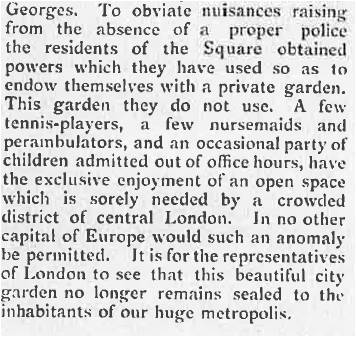 Hunter does a skillful rhetorical job of both praising the trustees for saving the Fields from development over the years and also pointing out the social injustice of a huge private space in a city that desperately needed public parks. The full article is here Sir Robert Hunter on LIF