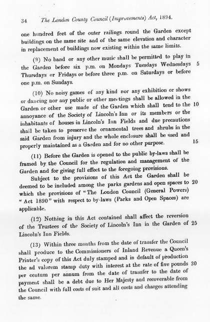 The Act dates from the point where the Council had bought a long lease on the Fields for £12,000 (about £1.2million in 2012 prices) from the freeholder, broadly the Honourable Society of Lincoln’s Inn. For a long period prior to 1894 the Fields had been private. In the Act the Trustees give up their private space and the Fields become public with protective provisions. The Act aims to protect the distinctive character of the Fields and to protect the environment for those who live and work around the green space – in particular the quiet studious nature of a legal and learning environment. This use-pattern that continues today. There is a long discussion in the House of Lords of the genesis of the Act from para 2457 in this Bill Committee debate.